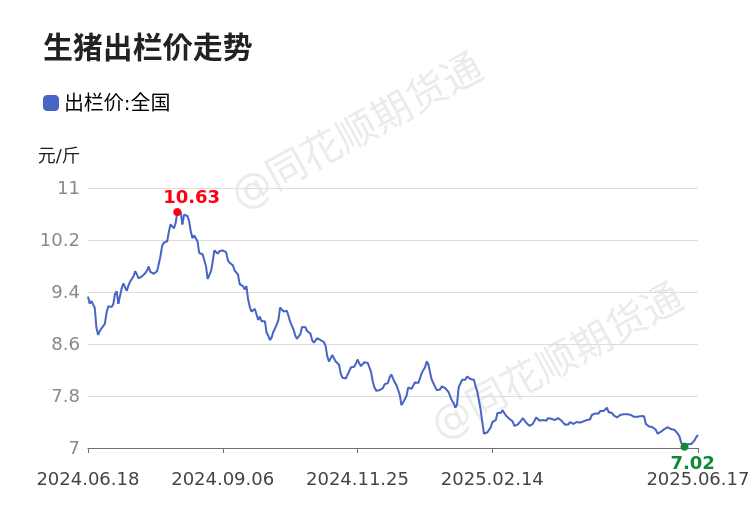 生猪出栏价6月17日已涨至7.20元/斤,当日涨幅0.42%,周涨幅2.56%,月跌幅1.77%。