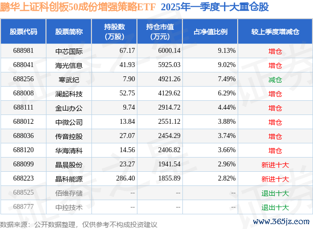 从基金规模来看牛操盘,鹏华上证科创板50成份增强策略ETF基金2025年一季度公布的基金规模为6.57亿元,较上一期规模6.26亿元变化了3145.27万元,环比变化了5.03%。该基金最新一期资产配置为:股票占净值比96.97%,无债券类资产,现金占净值比2.86%。从基金持仓来看,该基金当季前十大股票仓位达53.43%,第一大重仓股为中芯国际(688981),持仓占比为9.13%。